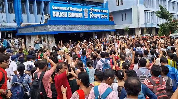 সল্টলেকের শিক্ষা বিভাগের সদর দপ্তর 'বিকাশ ভবন'-এর বাইরে এক হাজারেরও বেশি শিক্ষক অবস্থান কর্মসূচি পালন করছেন।