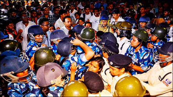 সল্টলেকে পশ্চিমবঙ্গ শিক্ষা বিভাগের সদর দপ্তর 'বিকাশ ভবন'-এর বাইরে অবস্থান বিক্ষোভের সময় স্কুল শিক্ষক এবং পুলিশ কর্মীদের মধ্যে সংঘর্ষ।