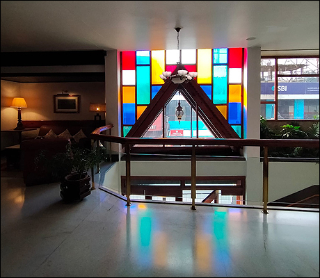 'শিলং অ্যাড্রেস' হোটেলের ডাইনিং হল থেকে ব্রেকফাস্ট সেরে প্রতিদিন নিজেদের রুমে ফেরার পথে কাচের একটা প্রকাণ্ড জানলা-দেয়াল পড়ত; রঙবেরঙের ছোটো ছোটো কাচ কখনো তেরছা করে কেটে, কখনো বা আয়তাকারে সাজিয়ে একটা অদ্ভুত সুন্দর জিওমেট্রিক আর্ট ফর্ম করা!