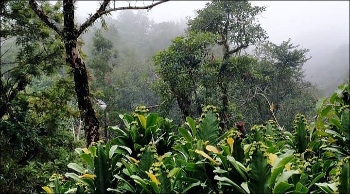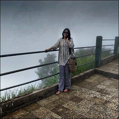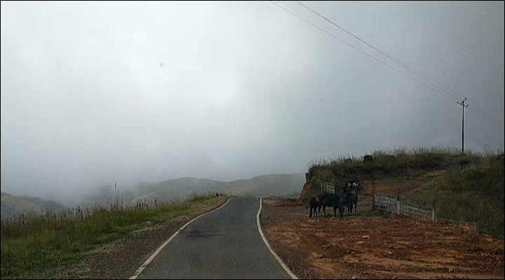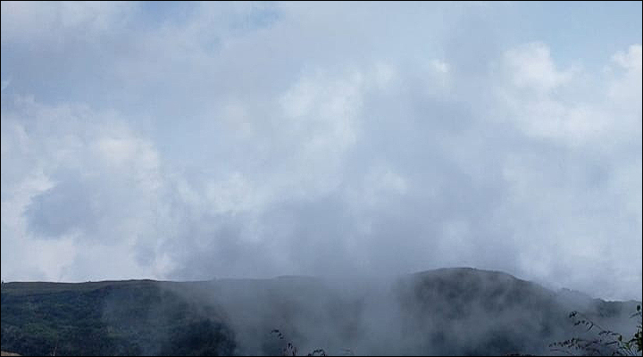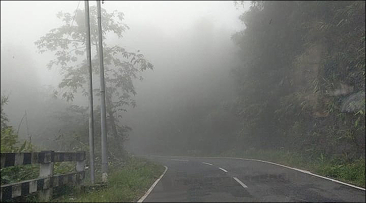 সাদা ঘোলা ঘোলা ধোঁয়ার স্তরে ঢাকা চারপাশে সন্তর্পণে পা ফেলে ফেলে, রেলিং দেওয়া খাদের একদম ধারে এসে অবশেষে দাঁড়ালাম। দাঁড়িয়েই রইলাম বেশ কিছুক্ষণ! খুব মিহি বৃষ্টিরেণু মুখে, গায়ে স্পর্শ বোলাচ্ছে; কিন্তু ভিজিয়ে দিচ্ছে না। রেলিঙের ওপাশে চাপ চাপ কুয়াশা, গা ছমছমে গভীর খাদ, খাদের বুক জুড়ে সবুজে ঠাসা বন আর স্তরে স্তরে মেঘরাজি। আর কিচ্ছু দেখা যাচ্ছে না।