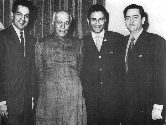 ভারতের তৎকালীন প্রধানমন্ত্রী জওহরলাল নেহরু-র সাথে (বাঁদিক থেকে) দিলীপকুমার, দেব আনন্দ ও রাজ কাপুর।