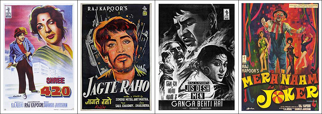 রাজ কাপুর অভিনীত চলচ্চিত্রের প্রচারচিত্র (বাঁদিক থেকে ক্রমানুসারে) 'শ্রী ৪২০' (১৯৫৫), 'জাগতে রহো' (১৯৫৬), 'জিস দেশ মে গঙ্গা বেহতি হ্যায়' (১৯৬০), 'মেরা নাম জোকার' (১৯৭০)।