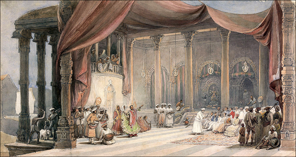 দুর্গাপূজার সময় কলকাতার একটি জাঁকজমকপূর্ণ ভারতীয় বাড়িতে নৃত্যশিল্পী এবং সঙ্গীতজ্ঞদের দ্বারা ইউরোপীয়দের আপ্যায়ন (১৮৩০-১৮৪০)। উইলিয়াম প্রিন্সেপ কর্তৃক অঙ্কিত।