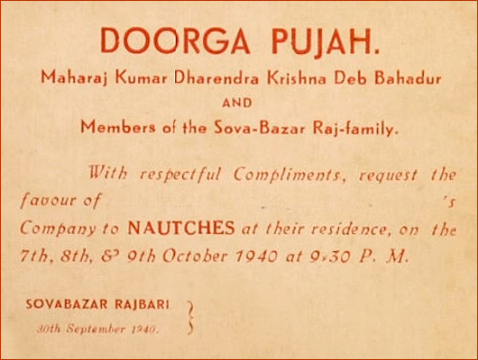শোভাবাজার রাজবাড়িতে দুর্গাপূজা উপলক্ষ্যে নৃত্যানুষ্ঠানের আমন্ত্রণপত্র।